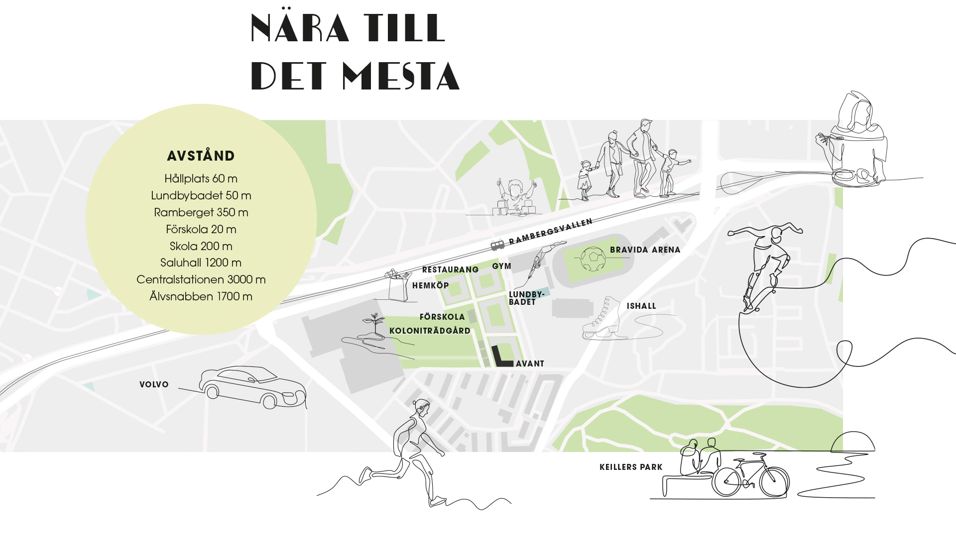 VÅRA LÄGENHETER HAR SAMTLIGA genomtänkta planlösningar, merparten med balkong eller uteplats i fritt läge. Runt hörnet ligger Ramberget och Keillers park, och med spårvagn tar du dig enkelt till city på bara nio minuter. Men redan utanför dörren finns det mesta du behöver som livsmedelsaffär, gym, bad, aktivitetsstråk, förskola, restauranger och kaféer. Och när det spritter i benen kan du ta en svängom på dansbanan på gården.