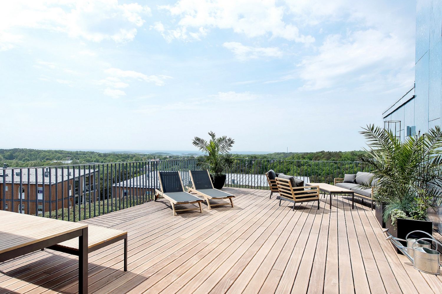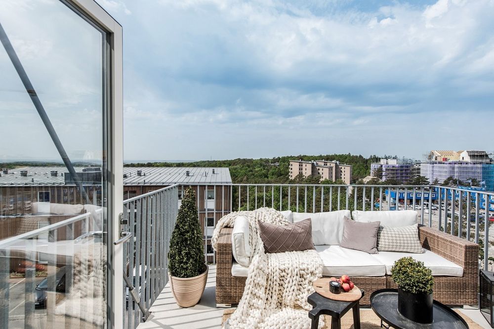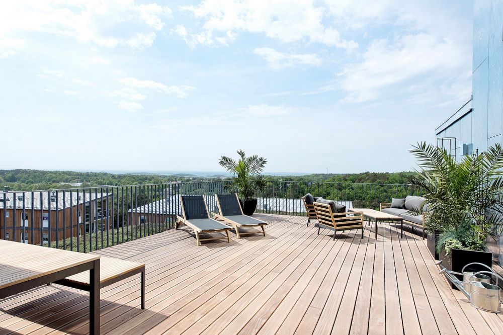 TERRASSER & BALKONGER Samtliga lägenheter har tillgång till varsin stor balkong. De är noggrant placerade i västlig och sydlig riktning och har gott om plats för både bord och stolar. På våningsplanet näst högst upp i huset i etapp 1 ligger den gemensamma terrassen som delas med etapp 2. Utsikten sträcker sig hela vägen från södra skärgården till den västra och likt balkongerna har den ett smidesräcke av galvat stål.