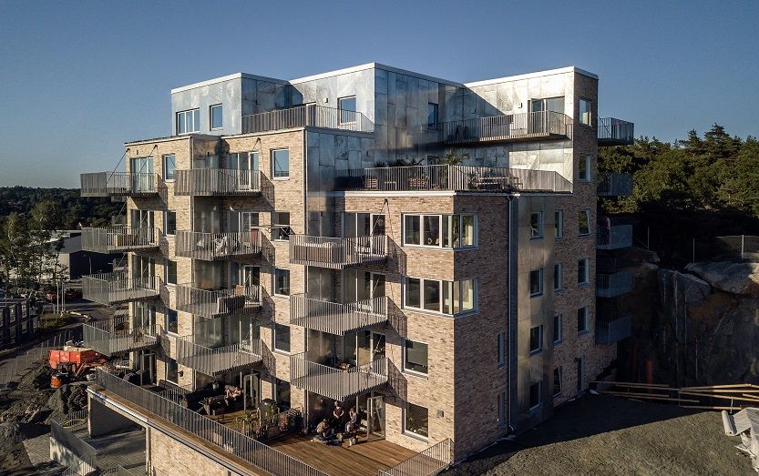 DE TVÅ HUSEN som Sverigehuset uppför på Uggleberget är de högst belägna tomterna i hela området. Arkitekturen är modern och konstruerad på ett sett som får dem att smälta in i bergssluttningen. Husen är också riktade mot väst, vilket ger maximalt med sol och samtidigt utsikt över havet. Fastigheterna är försedda med ytor som kan samutnyttjas av de boende. Detta innefattar en stor gemensam takterrass, en relaxavdelning med bastu och garage med tillgång till hiss för alla som bor i huset.