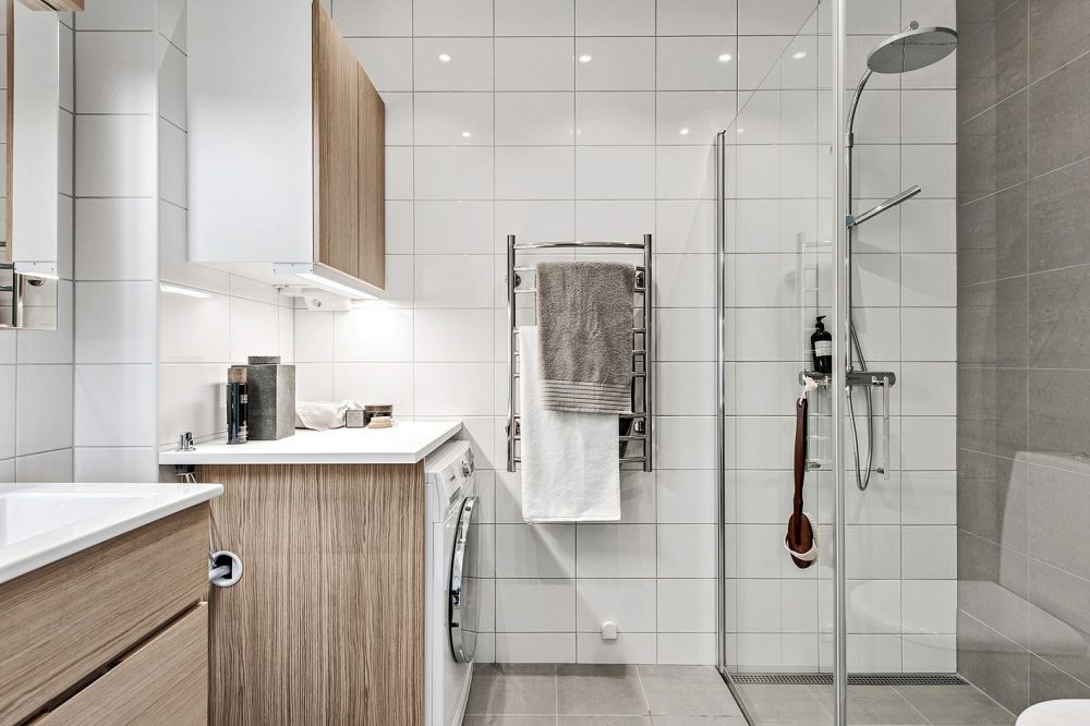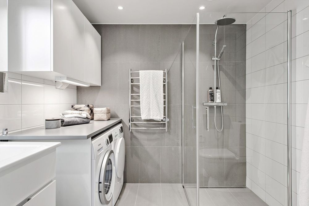 BADRUM Lyxigt badrum med takdusch, avlång duschbrunn längs väggen. På golvet ligger gråmatt granitkeramik som också klär en utav väggarna. Övriga väggar består av vitt kakel. Duschvägg i klarglas, infällda spotlights i taket samt tvättmaskin och torktumlare. Vitt badrumsskåp från Svedbergs med tillhörande spegel, flyttbara hyllplan i glas med LED-belysning.