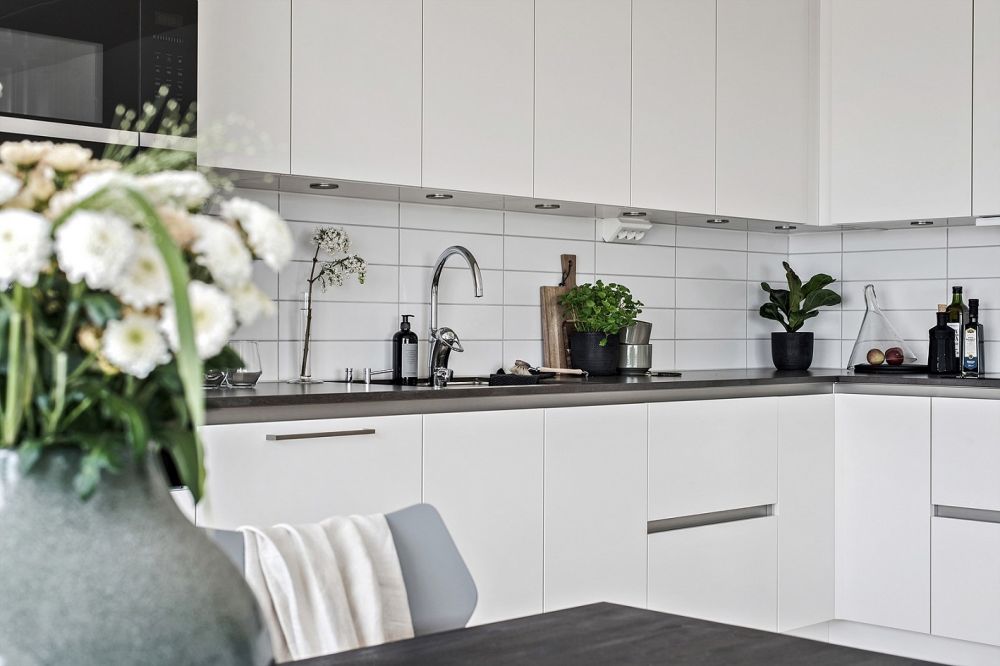 KÖK Modernt kök från HTH med integrerad kyl, frys och diskmaskin samt en underlimmad diskho. Matta alternativt blanka vita skåpsluckor med handtag i stål, lådor med fullutdrag och dämpad stängning samt en mörkgrå bänkskiva. Lägenheterna har kök med öppen planlösning ut till allrummet som både blir snyggt och praktiskt. Hemmet blir mer socialt, öppet och ljust.