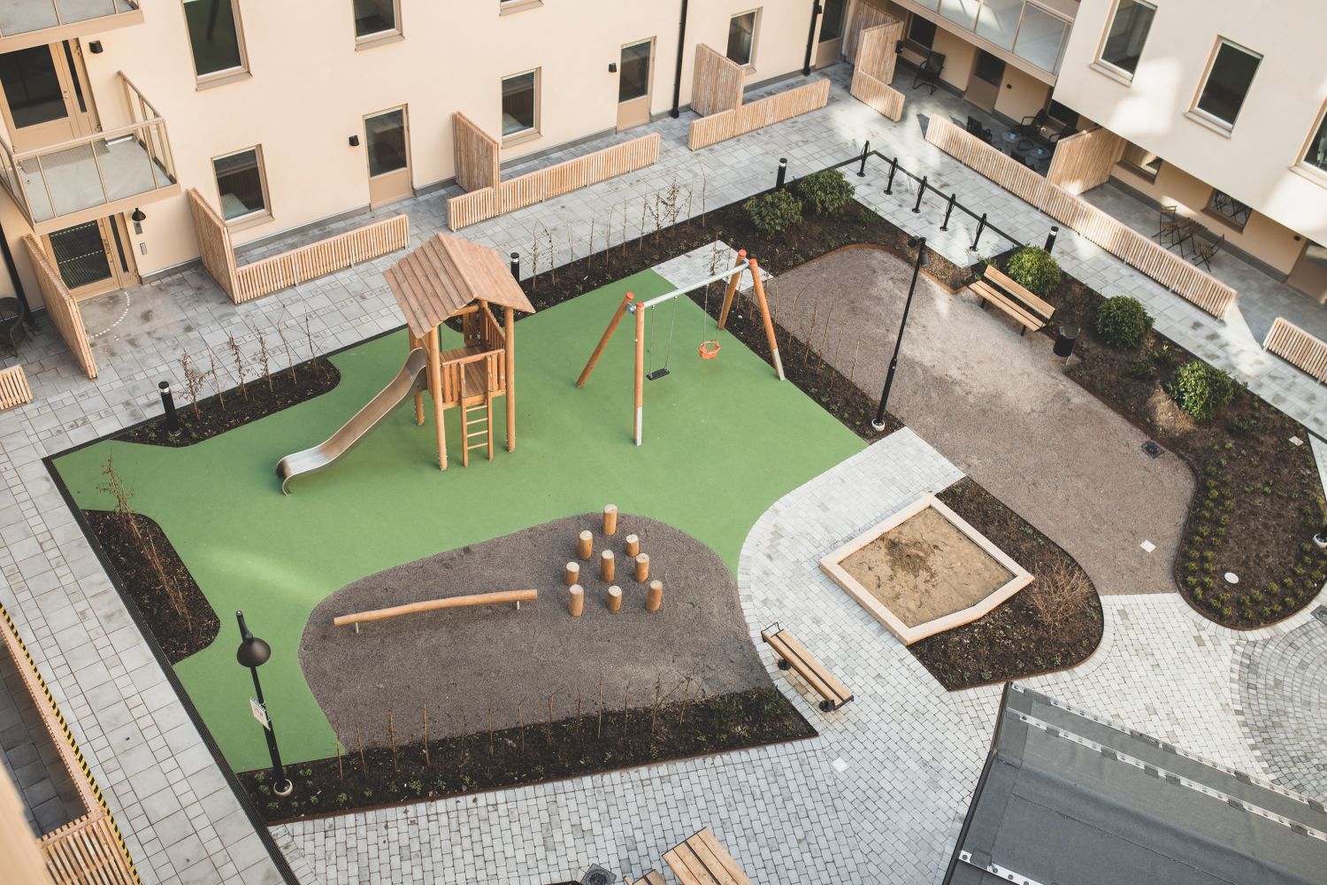 Kvarterets innergård följer samma materialpalett som området i övrigt och har en varmbeige slätmålad fasad med matchande färg på fönsterkarmar och plåtarbeten.