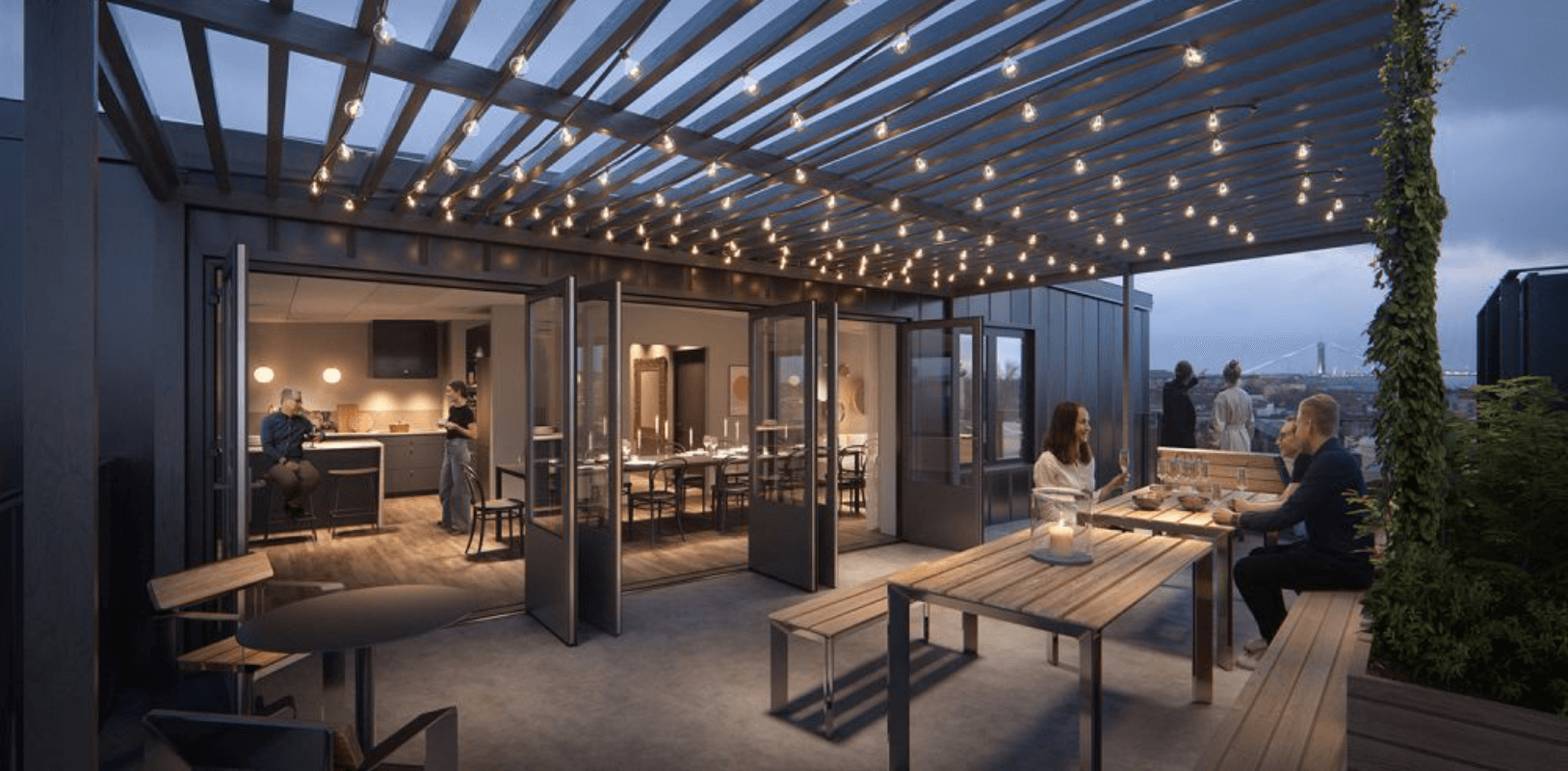 UTSIKTEN ÄR NÅGOT ALLDELES EXTRA och på takterrasserna kommer det att finnas kikare för att kunna spana in staden. Vi har delat upp takvåningen i två separata lokaler. I den ena blir det en stor festvåning med kök och möjlighet att duka upp för 30 personer både inne och på den stora takterrassen. I den andra delen blir det spaavdelning med bastu, lounge och relaxavdelning både inne och ute på den stora takterrassen, litet kök med kylmöjlighet och spabad med utsikt över staden. Det kommer dessutom finnas övernattningsrum för gäster.