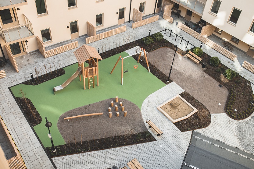 Kvarteret omsluter en gemensam innergård, med lusthus, lekplats och boulebana. Planteringar i form av buskar med ätbara bär. Ut mot gatan, i entrénivå, har vi skapat en levande stadsmiljö med skönhetssalong, godisaffär, gym och en restaurang.