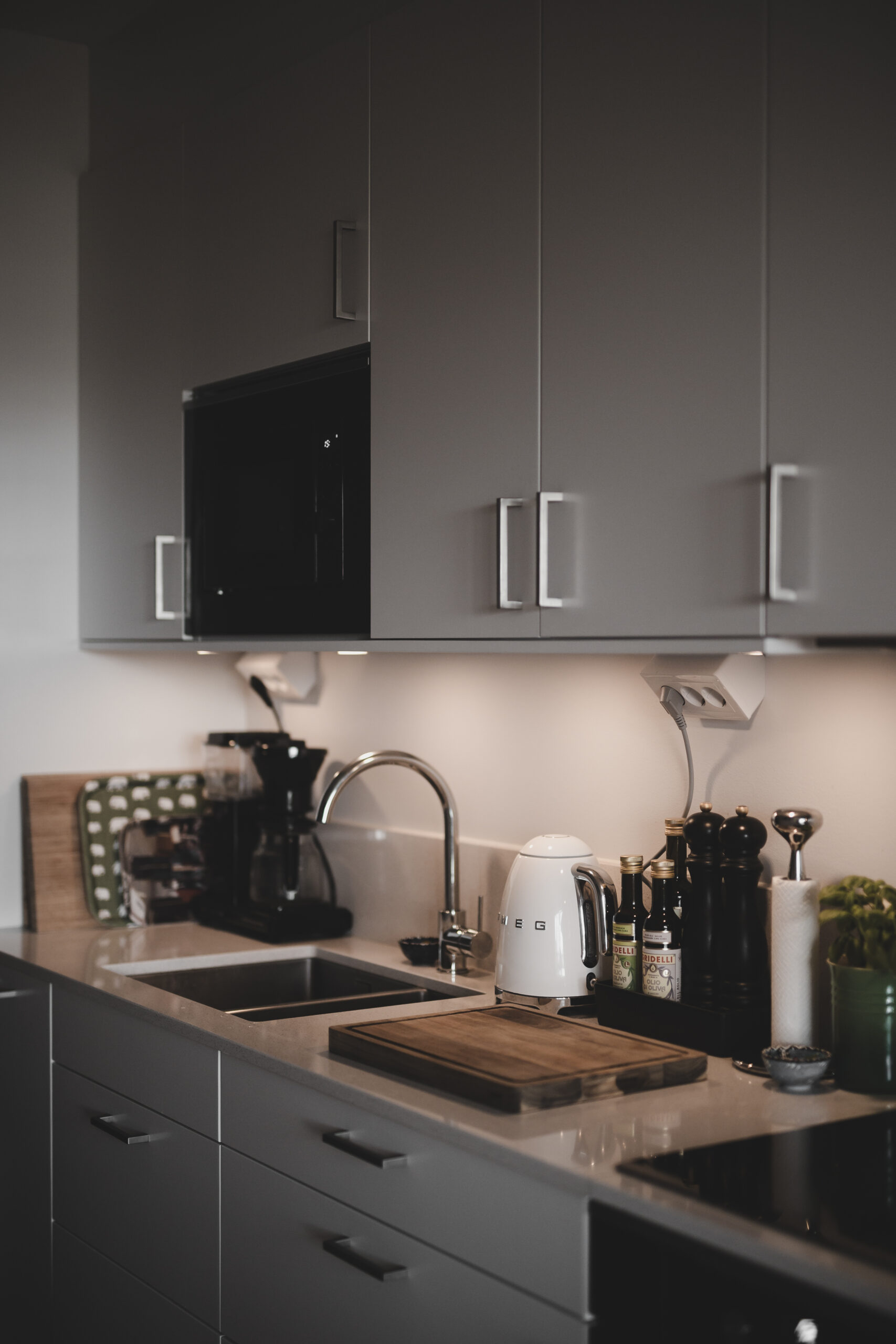 I de gemensamma utrymmena har vi hållit materialpaletten elegant återhållen i ljust grått och svart med detaljer i mässing, som en blinkning i uttrycket till gamla biograffoajéer.