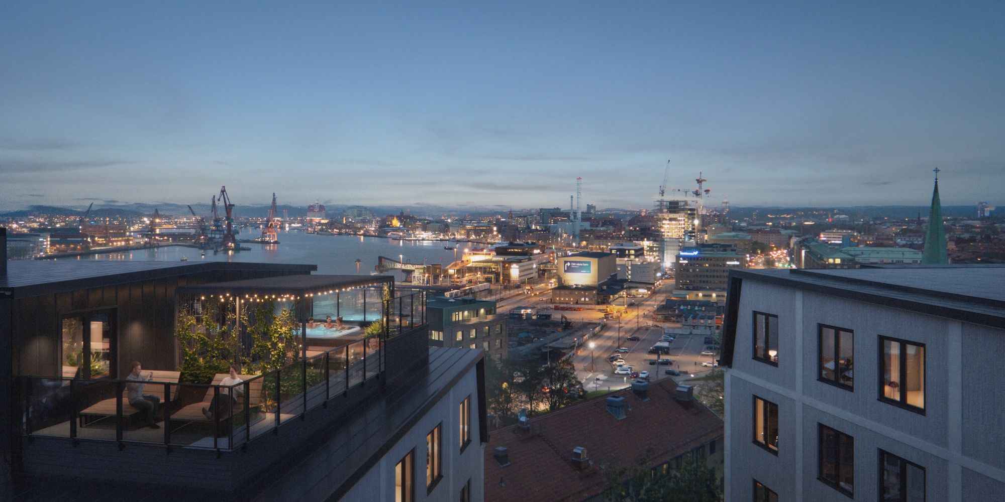 UTSIKTEN ÄR NÅGOT ALLDELES EXTRA och på takterrasserna kommer det att finnas kikare för att kunna spana in staden. Vi har delat upp takvåningen i två separata lokaler. I den ena blir det en stor festvåning med kök och möjlighet att duka upp för 30 personer både inne och på den stora takterrassen. I den andra delen blir det spaavdelning med bastu, lounge och relaxavdelning både inne och ute på den stora takterrassen, litet kök med kylmöjlighet och spabad med utsikt över staden. Det kommer dessutom finnas övernattningsrum för gäster.
